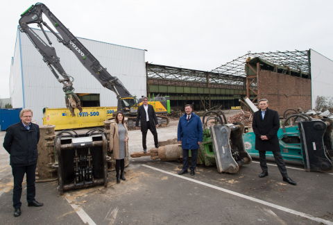 Mit dem Start der Abrissarbeiten an der ehemaligen Knauf-Interfer-Halle nimmt die Quartiersentwicklung an der nördlichen Speicherstraße des Dortmunder Hafens Fahrt auf. Bis Ende des Jahres werden weite Teile der rund 27.000 Quadratmeter großen Halle abgetragen. Erhalten bleiben wird das Stahlgerüst des 26 m x 230 m großen Mittelschiffs, das aus zwei Teilen bestehend und in den 50er bzw. 60er Jahren errichtet wurde.