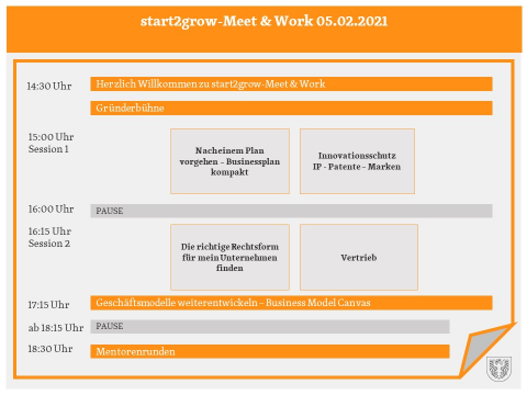 Am 5. Februar findet ab 14:30 Uhr start2grow-Meet & Work als Online-Veranstaltung statt. Eine Anmeldung ist ab sofort unter https://www.eventbrite.de/e/start2grow-meet-work-tickets-135974119251 möglich.