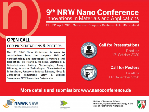 Statt wie gewohnt im Herbst findet die 9. NRW Nano-Konferenz am 21.-22. April 2021 in der MCC Halle Münsterland statt.